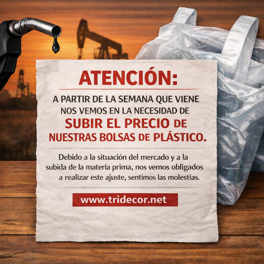 En Tridecor (www.tridecor.net), trabajamos constantemente para ofrecer productos de calidad al mejor precio. Sin embargo, debido a la subida del coste del petróleo, los precios de producción de las bolsas de plástico han aumentado considerablemente, afectando a toda la cadena de suministro.