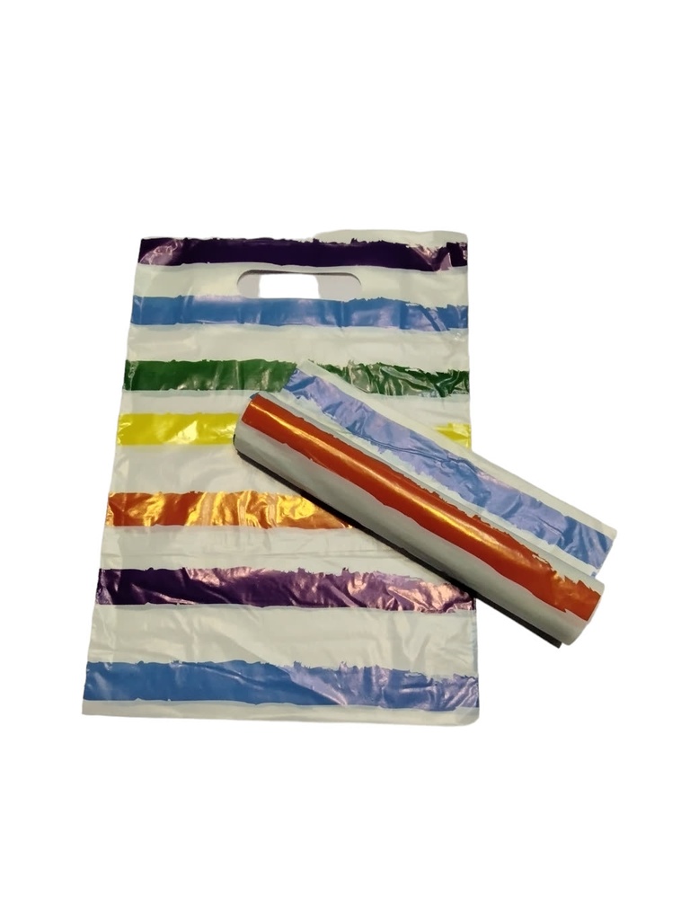 Transforme o simples ato de comprar em uma experiência vibrante e alegre com o nosso Saco de Plástico Arco-Íris com Alça Vazada! Ideal para uma variedade de usos – desde embrulhar aquele presente especial, embalar suas criações de artesanato, até transportar vestuário, acessórios, sapatos e utensílios de casa. Não há limites para a praticidade e a explosão de cores que nossos sacos podem oferecer à sua rotina de compras ou à experiência de seus clientes, se você for um comerciante.
