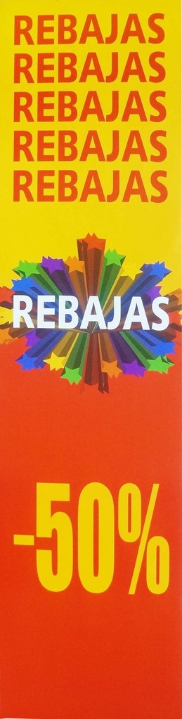 ¡Prepárate para destacar tus ofertas como nunca antes con nuestro CARTEL VERTICAL DE REBAJAS! Este vistoso cartel captará la atención de todos, gracias a su llamativo diseño en colores rojo y amarillo, perfecto para anunciar descuentos y promociones en tu negocio.