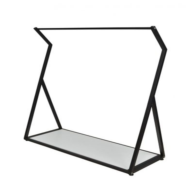 [038299] Schwarzer Metallgarderobenständer an der Seite mit Holzbrett