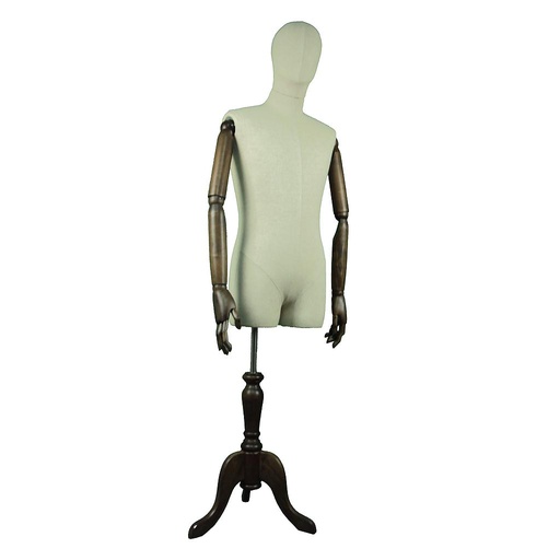 [040766] Buste masculin en lin avec tête et bras articulés, base en bois
