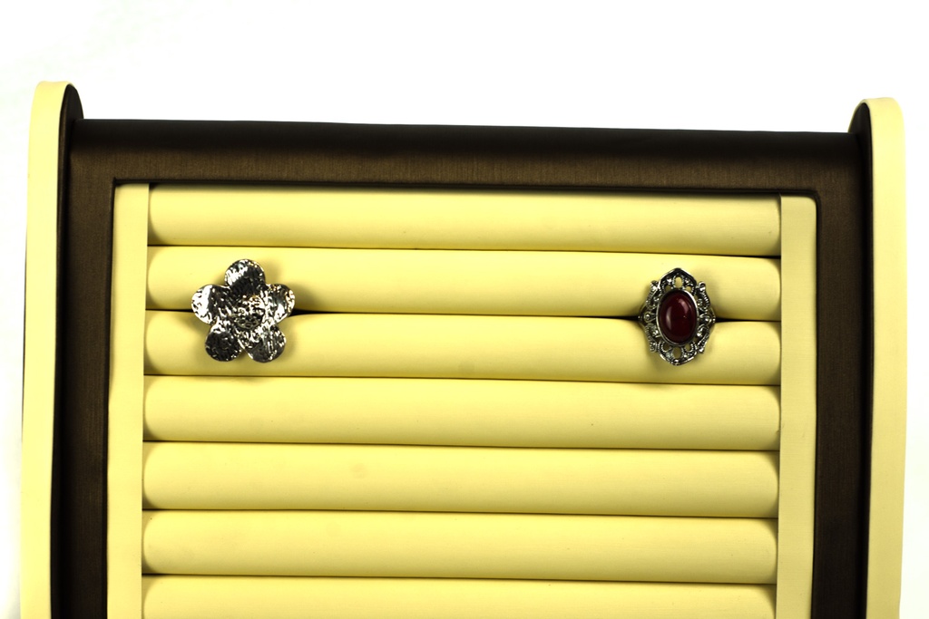 Non fatevelo sfuggire, aggiungete un tocco di eleganza al vostro spazio con il nostro espositore per anelli in finta pelle vaniglia/cioccolato. I vostri gioielli meritano un posto d'onore!