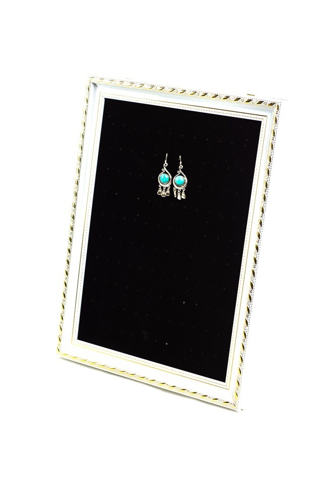 Descoperiți rama noastră excepțională pentru cercei, concepută pentru a adăuga o notă de eleganță și organizare colecției dumneavoastră de bijuterii. Cu o structură robustă din lemn, decorată în nuanțe rafinate de alb și auriu, această ramă este întregită perfect de panoul său din catifea neagră, oferind nu doar un contrast vizual deosebit, dar și o protecție delicată pentru bijuteriile dumneavoastră prețioase.