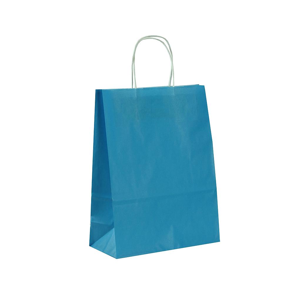 Pungi de hârtie cu mânere torsadate în culoarea cerului azuriu, dimensiuni 32x12x23 cm. Pachetul include 25 de unități.