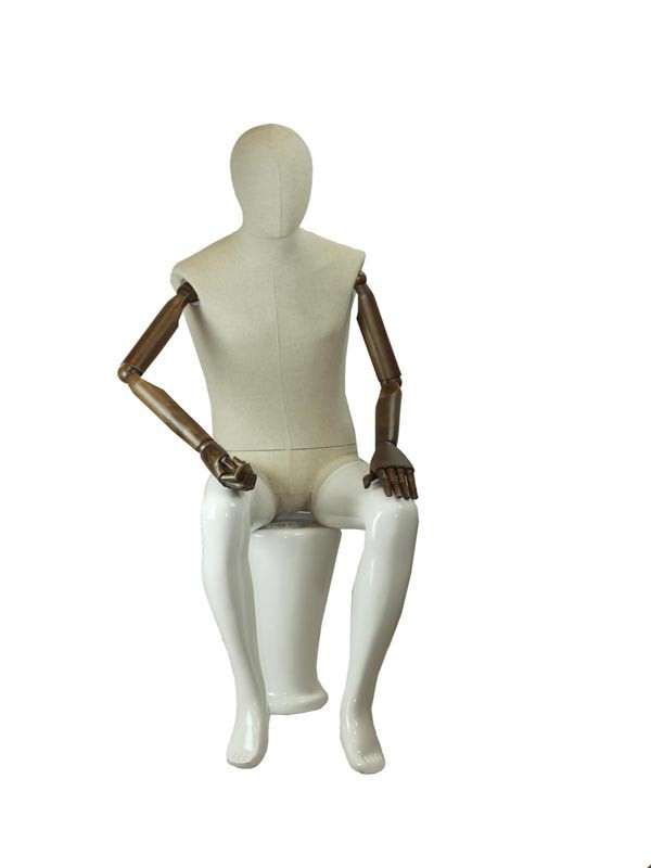 [040874] Manechin de bărbat așezat cu brațe articulate din țesătură și fibră de sticlă alb lucioasă
