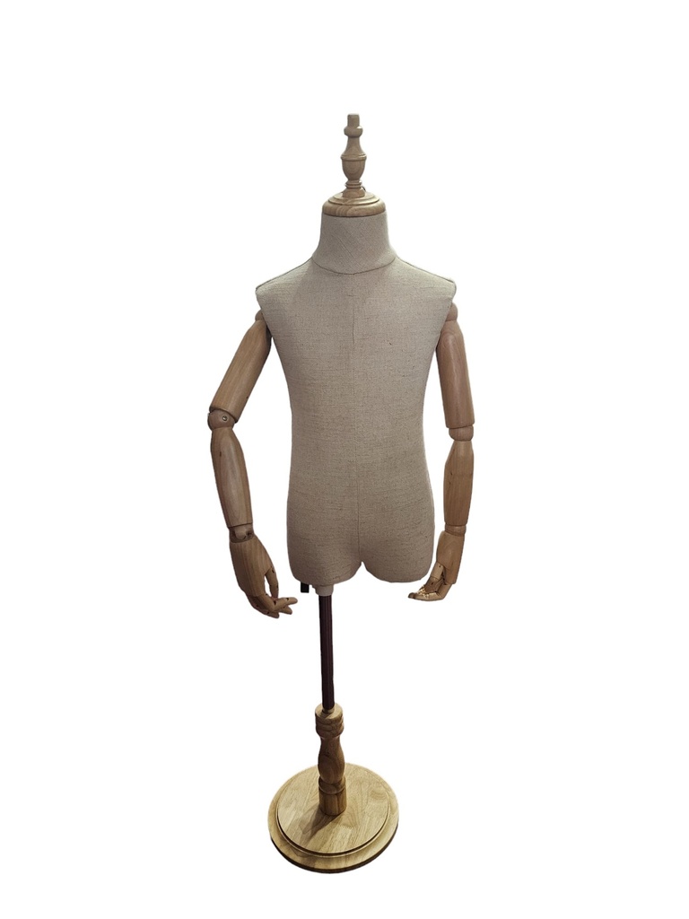 [040896] Bust de copil din țesătură cu cupă cu braț articulat și bază rotundă din lemn ușor
